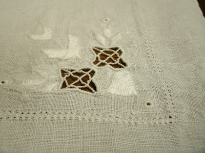 linen table scarf, snowflake platter, gilt thin porcelain cup and saucer, hand embroidered and applique rose napkin with scalloped edge, ans a cute luster japan pelican salt shaker.